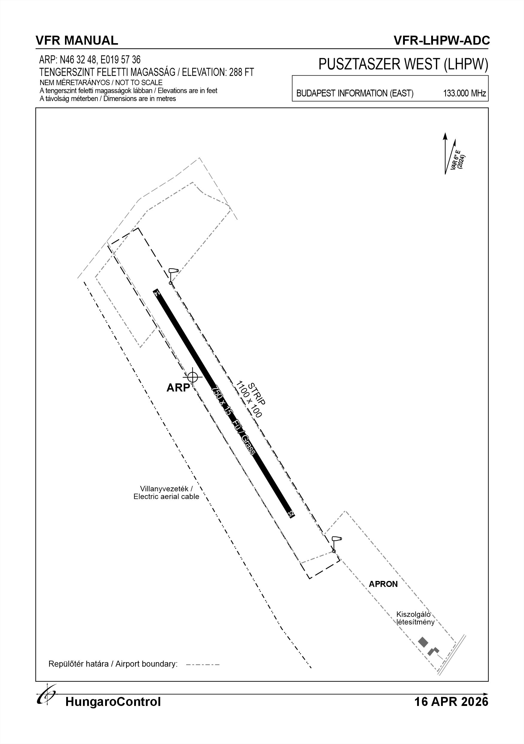 Nem közforgalmú, Nem nyilvános, Csak előzetes egyeztetés alapján.Az ARP helye megegyezik a 36-4413-as számú állandó geodéziai ponttal, amely a pálya középvonalától nyugatra 4 méterre, 15-ös küszöbtől 156 méterre található. A talajszinttel teljesen egy síkban van, a repülést egyáltalán nem befolyásolja.
